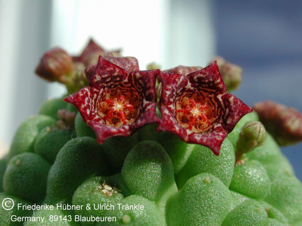 Pertenece a la familia de las Asclepiadaceae. Las Larryleachias me parecieron super bonitas por sus pequeñas y vistosas flores. Leva conmigo unos 20 días y por ahora lo que se, es por lo que he leido. Necesita semisombra, riegos en primavera y verano, dejando de regar en otoño y nada en invierno. Soporta bien las heladas en ausencia de riego. Ya veremos como nos va con ella.
